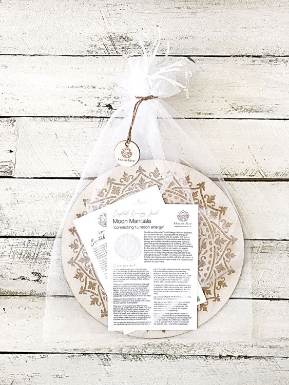 This Moon Mandala Crystal Energy Grid is a beautiful tool to work with your crystals and the energy of the moon, it’s mysteries and it’s cycles. This grid is perfect for meditation, for connection with feminine energy and to help you with creating new paths of personal growth and positivity of working with moon energy. A few crystals to keep in mind when choosing for this grid are Moonstone as it works to amplify the moon’s energy; Selenite for recharging; Clear Quartz for clearing and purifying and Labradorite for strengthening your intuition. It is also a wonderful grid to help you cleanse your crystals with the full moon - a clean and stable environment made of a natural wood element for grounding.